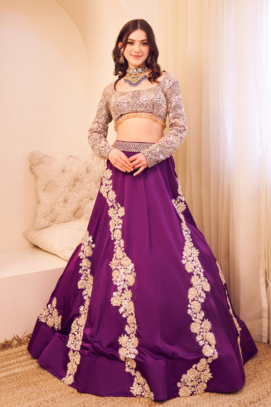 Nyra purple satin silk lining shantoon embroidery sequin ambrosia lehenga set
