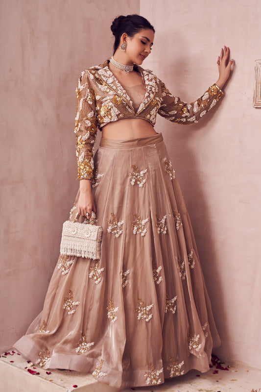 Magical rose gold lining shantoon embellished peplum blouse with lehenga