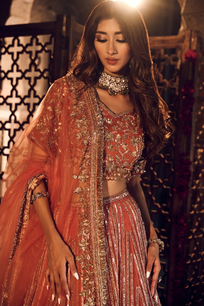 This rust-hued lehenga, crafted in net and kora organza, has an allure that draws you in with its elegance. Intricate sequins, cutdana, nakshi, and beaded work come together to create a masterpiece. The elbow-length blouse with a delicate leaf neckline adds a touch of understated regality, perfect for a bride who wants to balance tradition with modernity.