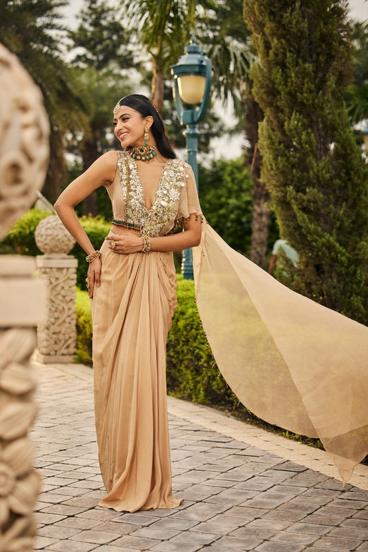 Millicent blush pink hand embellished georgette and net saree set with sweetheart neckline