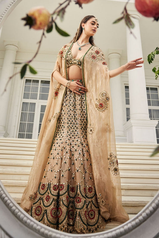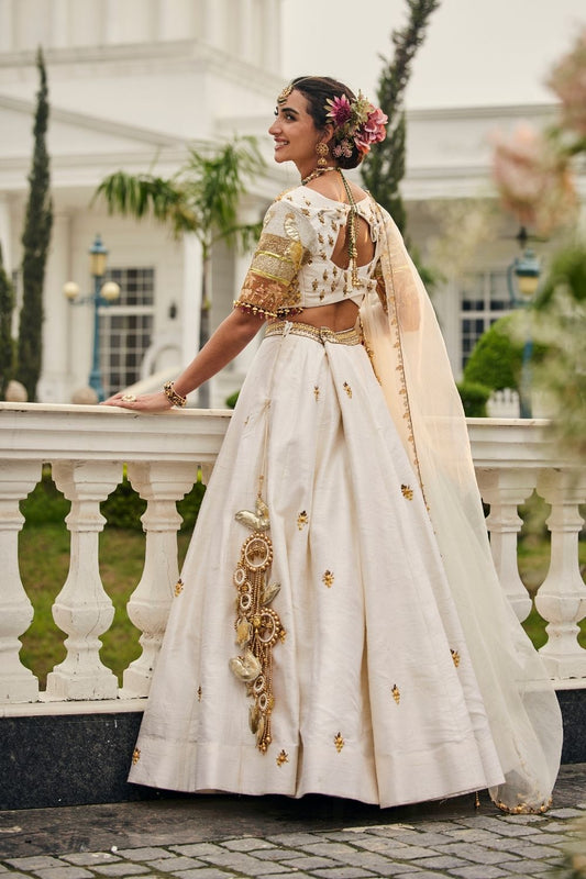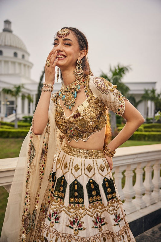 Cordelia ivory pearl embellished crepe and net lehenga set with zero neckline