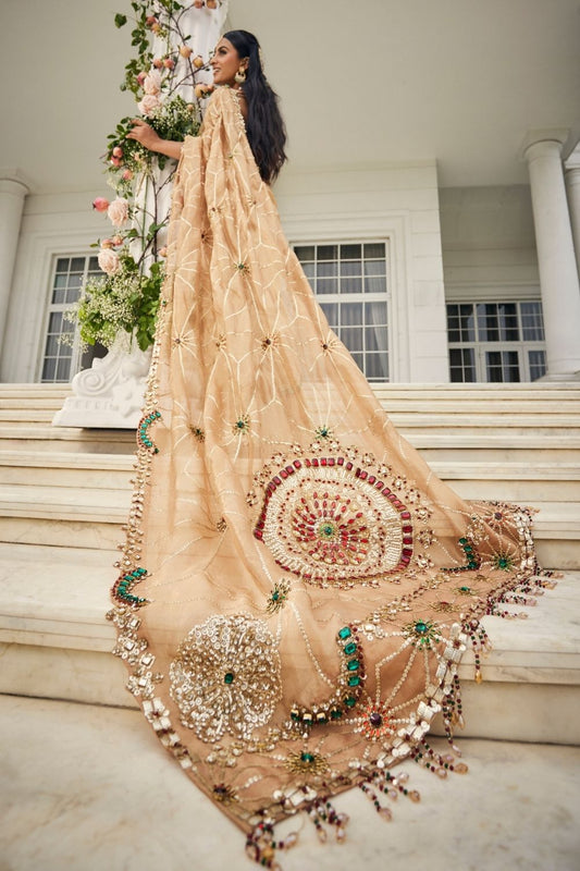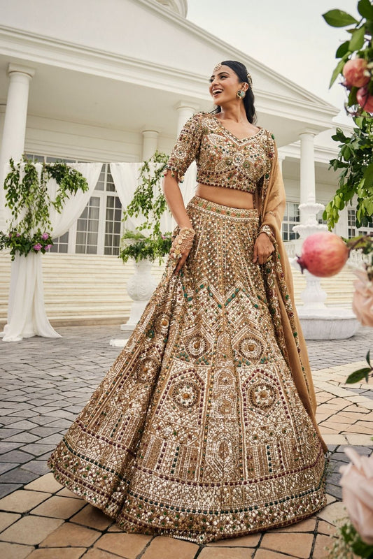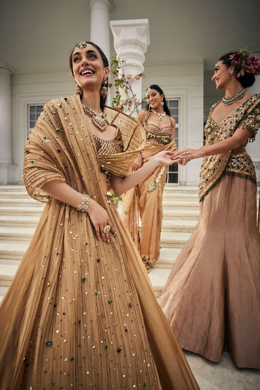 Rosalind ivory pearl embellished georgette and net lehenga set with sweetheart neckline