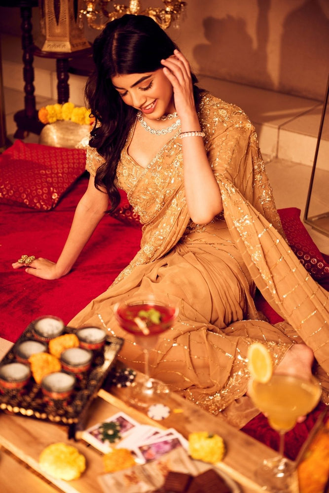 Slip into the golden saree, with it’s shimmering georgette that cascades effortlessly over you! The leaf-neck blouse enhanced by the pearls and cutdanas, adding the right touch of opulence for the get together you were waiting for! It’s the fusion style everyone seems to be after!