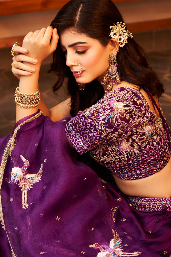 The sangeet night comes alive as she grooves in her deep purple lehenga, shimmering with sequins, crystals, cutdana, and nakshi work. A deep leaf-neck blouse with elbow sleeves adds elegance, while hand-embroidered birds and heavy tassels sway with each step, adorning the Dupion silk and kora organza. With every twirl, the lehenga captures the magic of shringar, making it impossible for her the crowd not to compliment her.