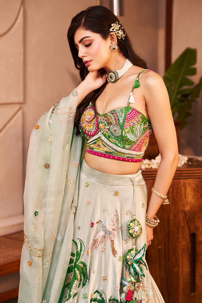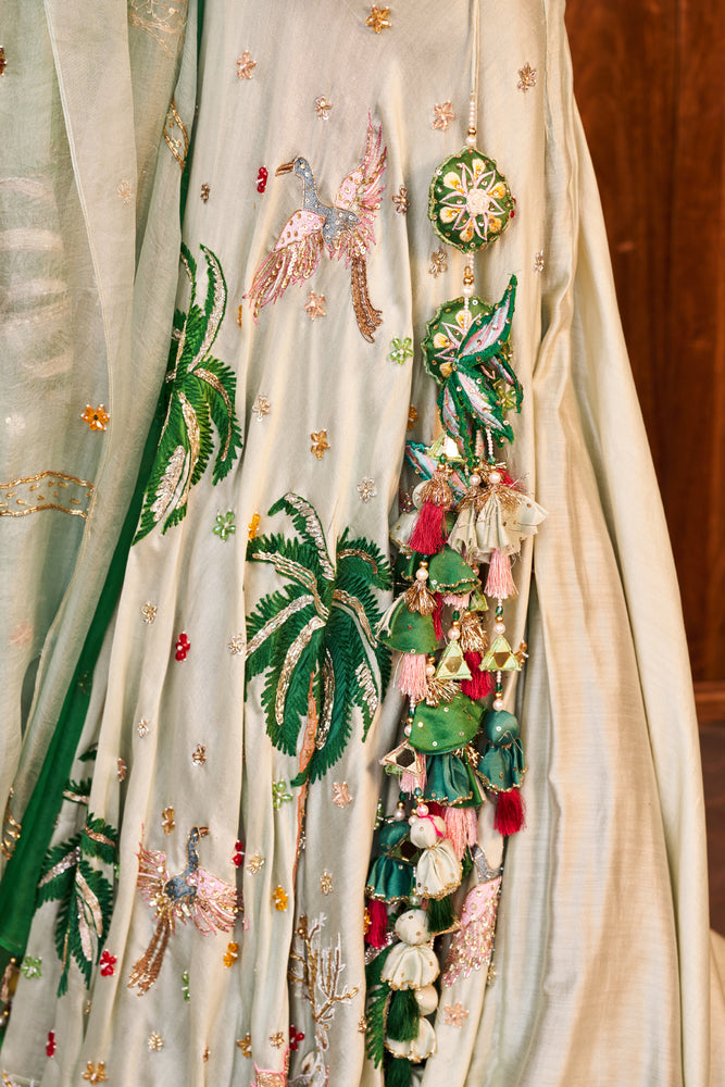 A vision of flora, sparkling with sequins and mirrors, the form fitting blouse hugs her just right, while the kora organza dupatta wraps around her like a tender, romantic whisper. Each embroidered detail on the Chanderi fabric whispers of timeless traditions, making this moment hers!