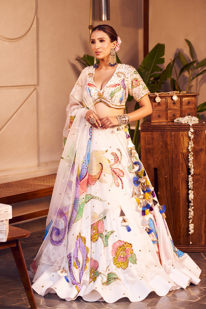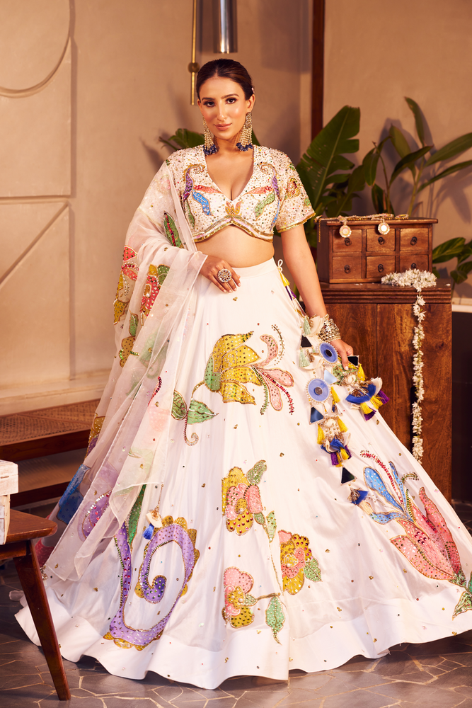 The lehenga set with the ivory base and bold hues is like a masterpiece that comes alive! With floral designs made more vibrant by the sequins and cutdana that surround it, she wears it for the day function that takes place in between nature!
