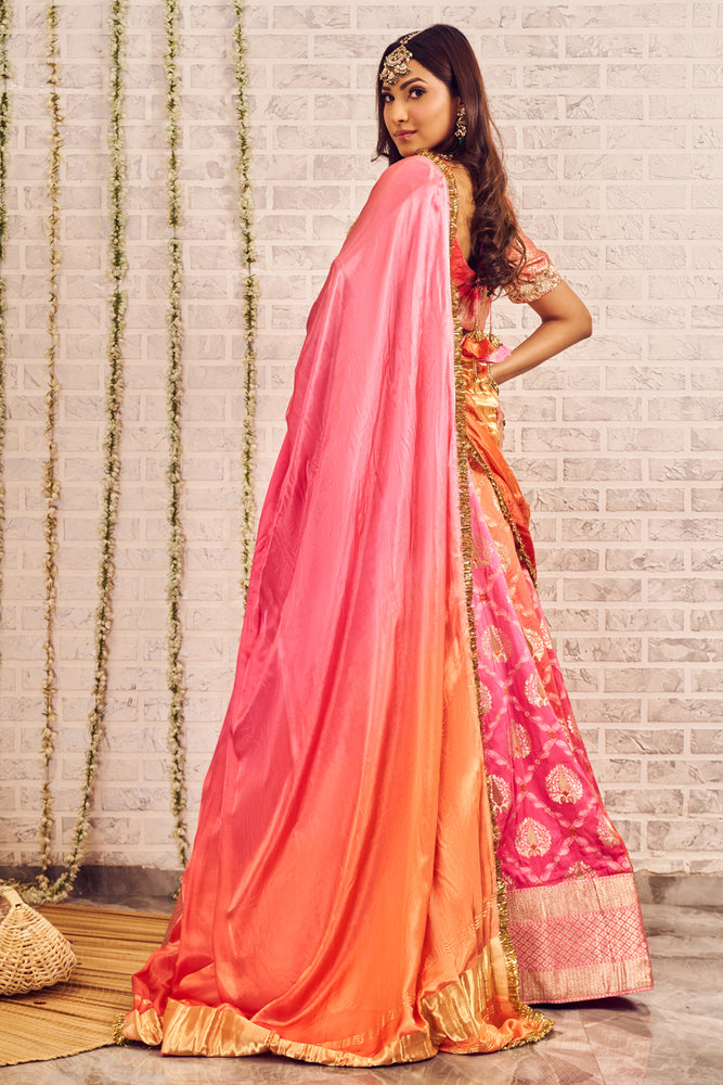 Shagna Moh Pink Orange Banarasi Skirt and Blouse with Dupatta Set