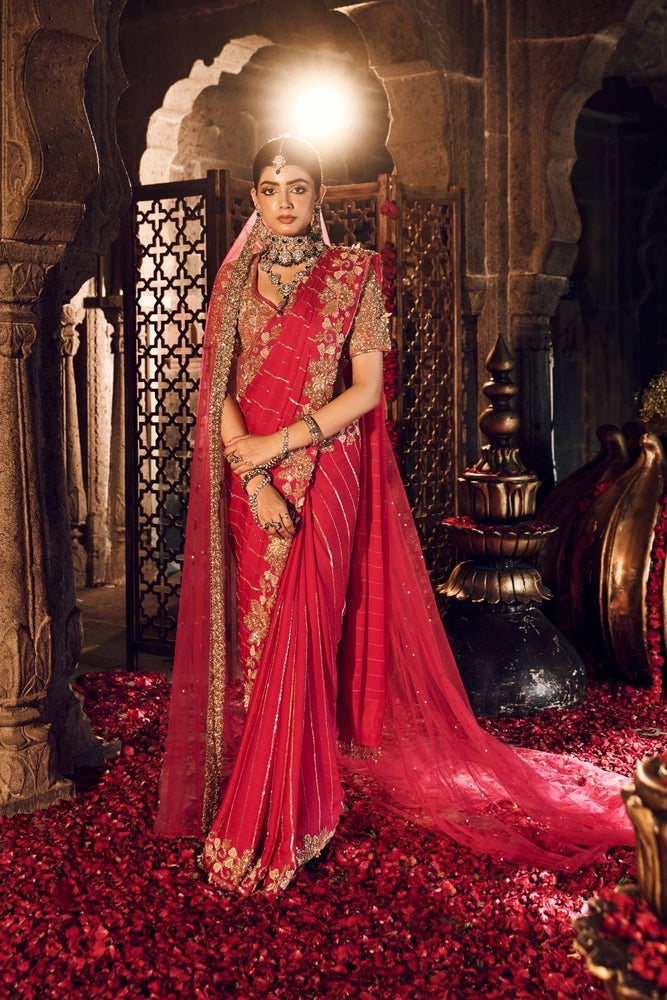 The saree is all about the timeless grace the bride embraces as gets ready for night! As she walks into the evening, the crepe fabric flows effortlessly, while the wide leaf neckline of the blouse frames her like a queen, making it perfect for a reception or an elegant cocktail night. A sight in magenta pink, she carries the call of tradition yet the charm of the contemporary.