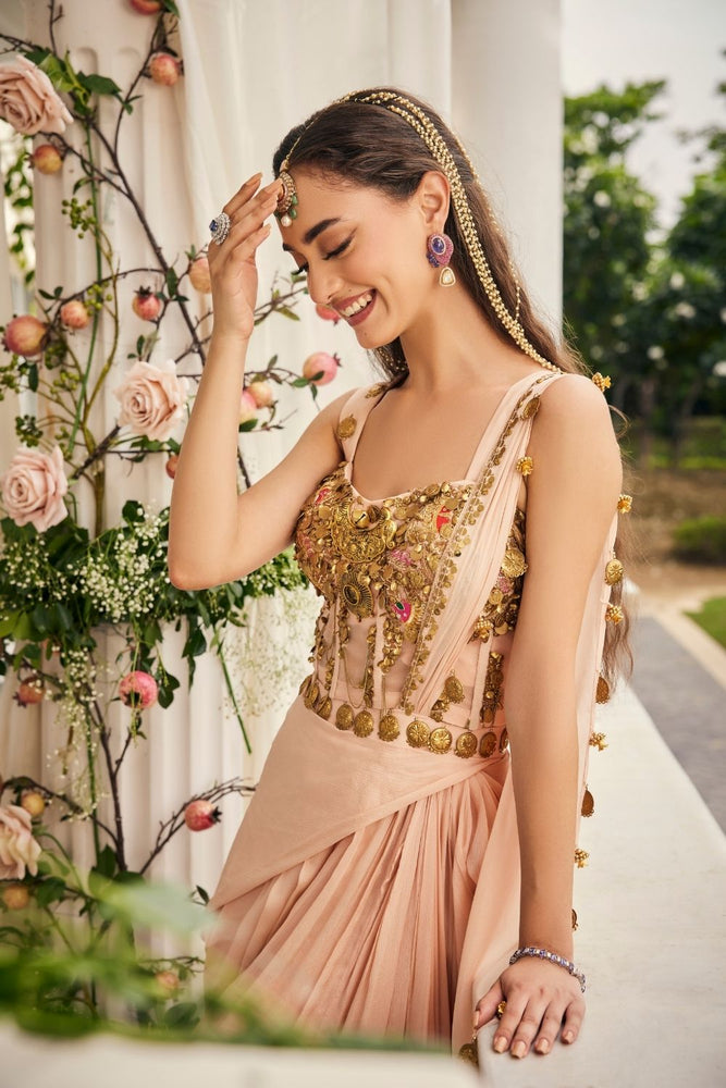 Blush pink has always spoken the language of romance, and in this saree it finds a new voice. Draped in fluid georgette, it moves like a sigh, light and effortless, its surface hand-embellished with gold details that sparkle like fleeting moments of joy. The sweetheart neckline softens the look with tender charm, making the saree feel less like attire and more like a mood - gentle, modern, and luminous. For the bride who chooses to celebrate love in ease and elegance, this chapter is written in whispers, yet remembered in brilliance.