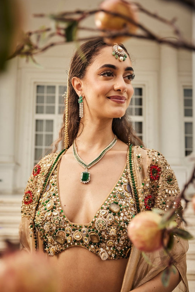 Some silhouettes are made to mirror the rhythm of the sea, and this mermaid lehenga does just that. In ivory tissue it glows softly, like moonlight on still water, while jewel-like scarlet and emerald embellishments sparkle as though scattered by hand across its surface. The glass neckline lends it a delicate edge, blurring the line between tradition and quiet modernity. Worn by the bride, it becomes less about fabric and form and more about the way it moves with her-fluid, sculpted, and luminous, like a secret only the ocean could tell.