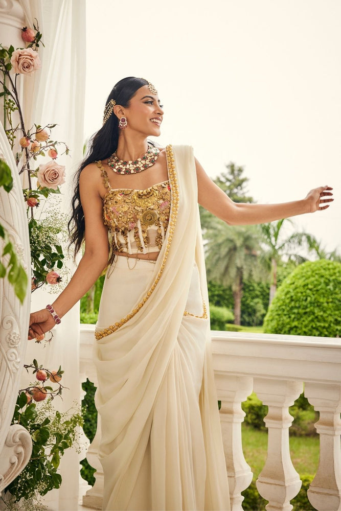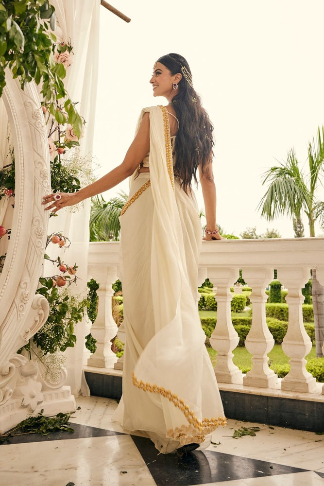 Not every chapter of a bride’s story is written in tradition-some are whispered in freedom, laughter, and ease. This contemporary saree in ivory georgette carries that spirit, flowing light as air, hand-embellished with scarlet and emerald accents that sparkle like moments of joy. Draped without weight, it becomes less about formality and more about feeling-an ode to the modern bride who celebrates love on her own terms, radiant in her simplicity, unforgettable in her charm.
