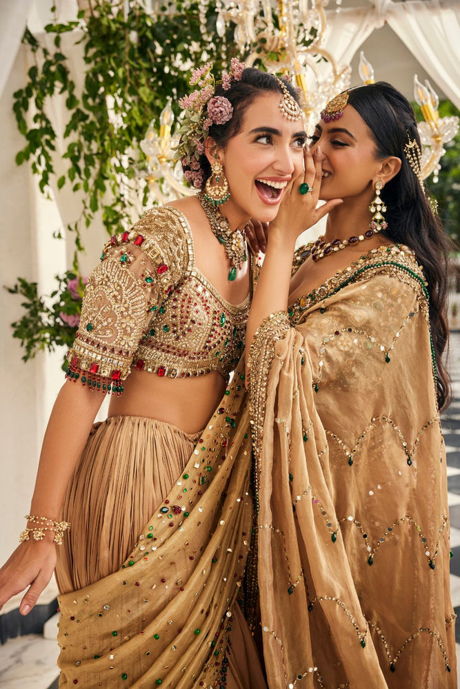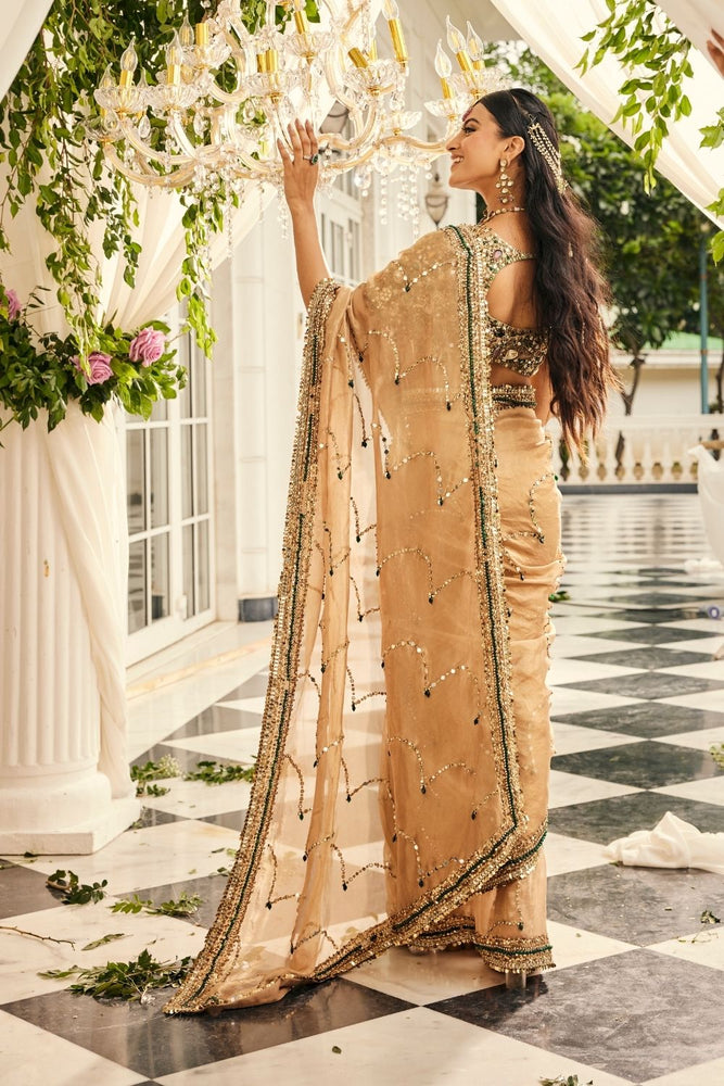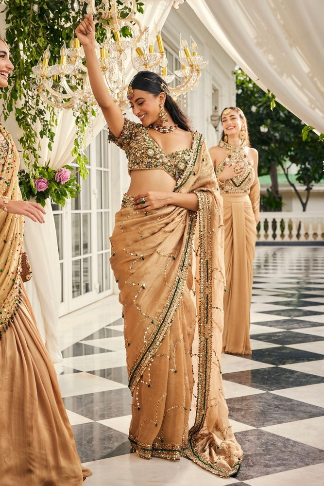 Gold has always been the language of celebration, and in this saree it unfolds with quiet majesty. Woven in tissue, it carries a natural radiance, its surface alive with scarlet and emerald jewels placed by hand like blessings gathered across time. The sweetheart neckline and elbow sleeves frame her presence with grace, creating a silhouette both timeless and tender. Draped around her, the saree does not demand attention, it simply holds it, becoming a memory of elegance that lingers long after the music fades.