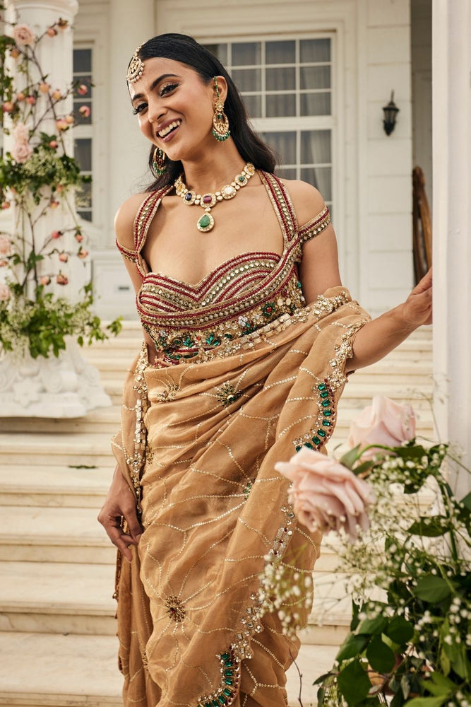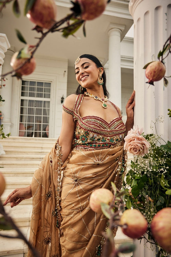 There is a certain kind of glow a bride carries when laughter, love, and promise all meet in a single moment. This saree captures that glow in gold tissue, its surface scattered with hand-embellished scarlet and emerald jewels that glint like secrets shared only with her closest circle. The sweetheart neckline, framed by delicate cold-shoulder straps, adds a whisper of playfulness to the elegance, reminding her that tradition can hold room for joy and freedom too. Draped around her, the saree becomes less an outfit and more a mood~radiant, intimate, and unforgettable.