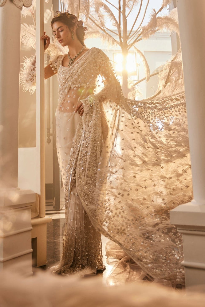 An ivory saree woven from delicate net fabric and adorned with shimmering stars. The intricate embellishments reflect the light in a stunning dance, creating an ethereal aura around the wearer. The blouse offers a modern touch while complementing the classic beauty of the saree. Perfect for morning weddings or any special occasion, this piece is ideal for those who wish to leave an unforgettable impression wherever they go.