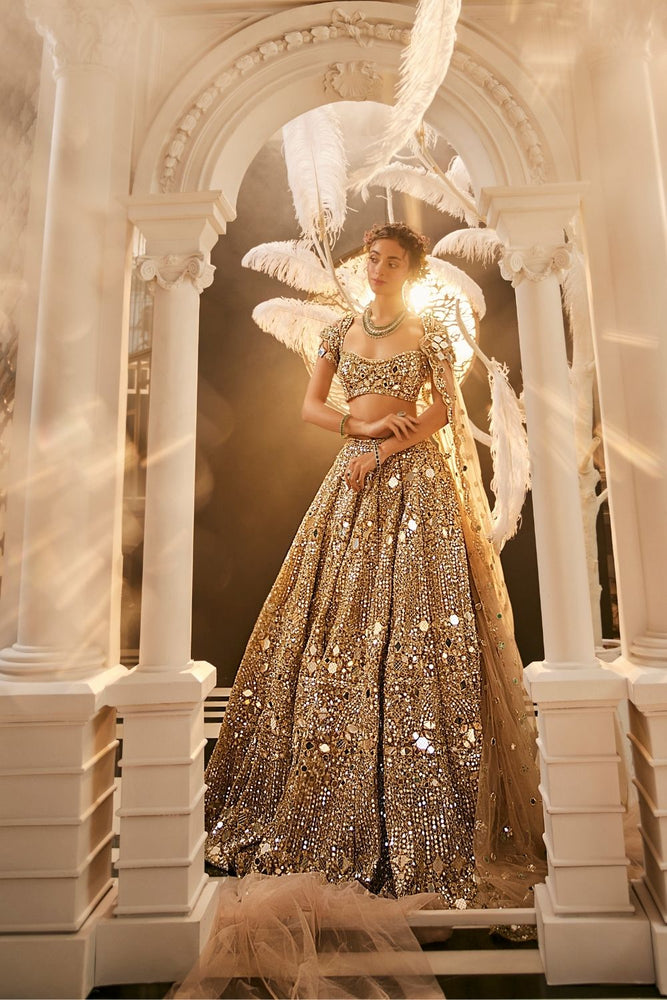 The moment she steps into the room, the golden lehenga commands attention. The net fabric, embellished with intricate mirror work, creates a stunning play of light and texture that feels both beautiful and otherworldly. The lehenga’s dramatic trail flows behind her like a river of gold, adding an element of grandeur with every step. The wide sweetheart neckline of the blouse, paired with the trail, rich with the same exquisite detailing, completes this show-stopping look for an unforgettable day.