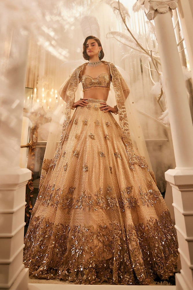 Beneath the grandeur of towering arches and sunlit corridors, this lehenga unfolds like a whispered secret of elegance. Its ivory hue, delicately embroidered, gleams softly as light filters. The wide sweetheart neckline and elbow-length sleeves exude timeless sophistication, while the airy net dupatta, cascades like a gentle veil of mist. Shimmering under fairy lights as she dances the night away.