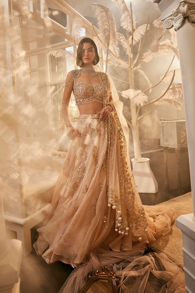 Bathed in the soft blush of dawn, this lehenga feels like a romantic ode to timeless beauty. The kora organza fabric shimmers delicately, with intricate work creating a symphony of sparkle. The sleeveless blouse, with crystals looping on the shoulders, offers a refined charm, while the airy dupatta with its border, adds a layer of elegance to the ensemble. The ensemble is perfect for a dreamy sangeet night or a serene daytime wedding ceremony.