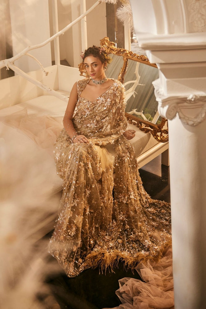 Ideal for a cocktail evening, in the soft glow of the castle’s golden hour, the saree glisten, its bold yet graceful design ensures she shines through every toast and turn. Crafted from delicate net and adorned with intricate cutdana, sequins, and crystals, it captures the essence of timeless luxury. The sleeveless blouse, strikes the perfect balance between classic sophistication and modern allure, while the saree flows effortlessly, pooling into soft waves of gold.