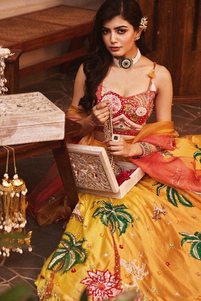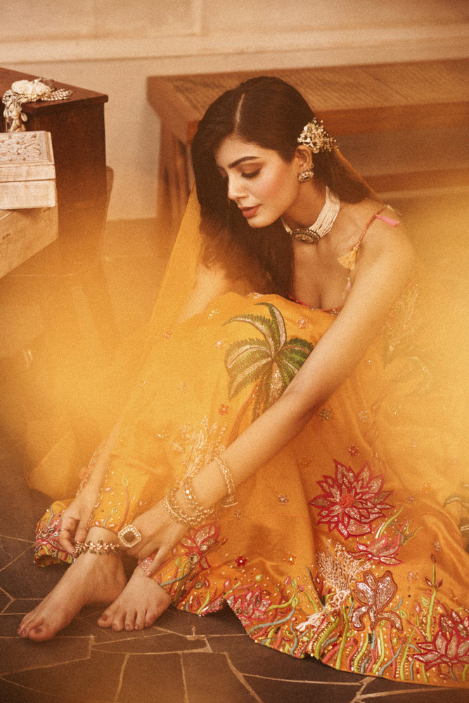 As she gets ready in her yellow lehenga, the shimmer of sequins, crystals, and more dances across the Chanderi and kora organza. The sweetheart neckline and sleeveless blouse bring a modern elegance, while colorful tassels catch their eye with every move, adding a playful touch. The lehenga is a celebration, capturing the essence of joy and tradition in every detail!