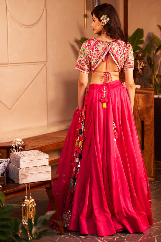 Oh, the sundowner Bride dressed in a hot pink lehenga hand-embroidered with Signature Swish birds taking flight, swaying trees and shimmering florals! As she gets ready for the pheras, the lehenga envelops her in a mix of anticipation and calm, perfectly complementing the warm glow of the setting sun.