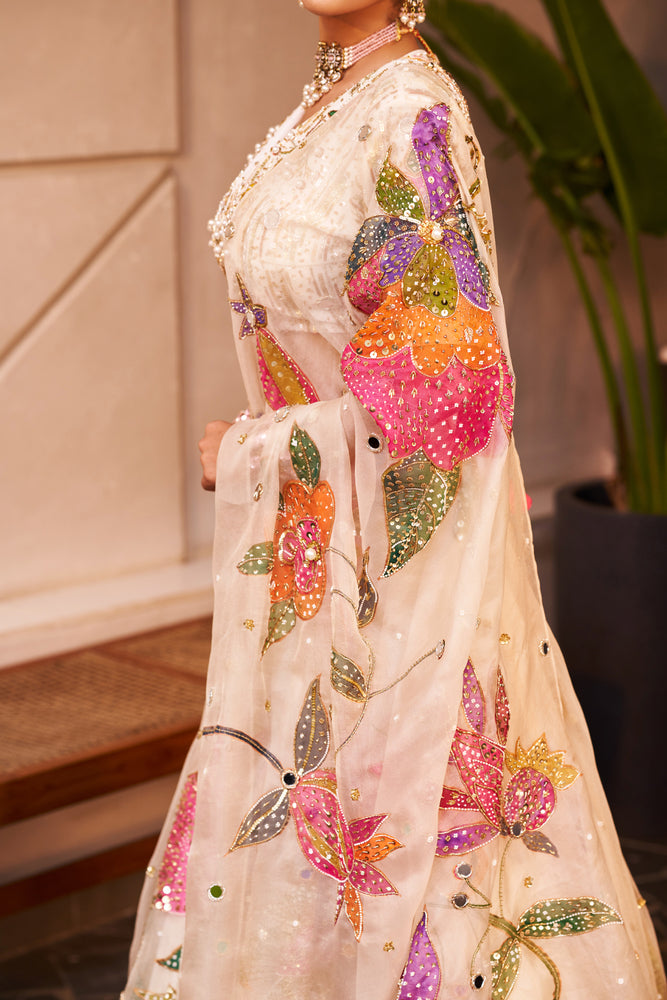 She steps into the room, all dressed up in a lehenga that shimmers with sequins, mirrors, cutdana, and nakshi work. The V-neck blouse with elbow sleeves highlights her elegance, while hand-painted florals bloom in vibrant colors across the Chanderi and kora organza. Each delicate detail fills us with awe, as she looks like a masterpiece come to life!