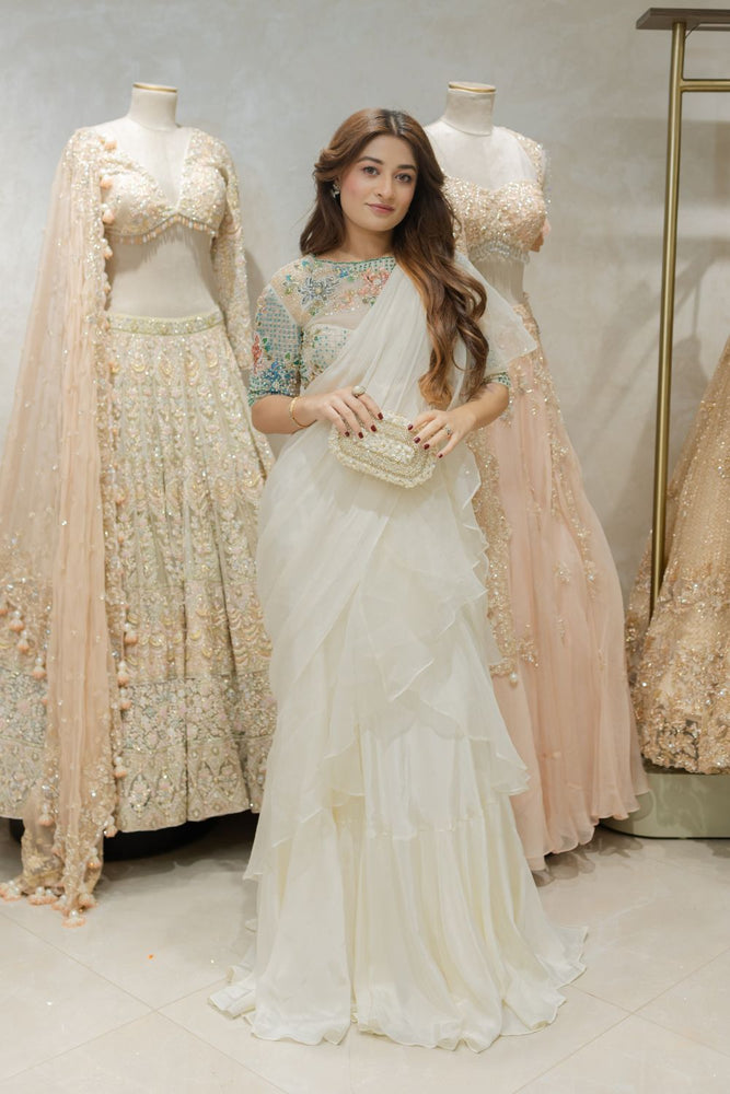 Ritika Bhandari in Meera Ivory Crepe Embellished Sequin Solid Pre-Draped Ruffle Saree With Blouse