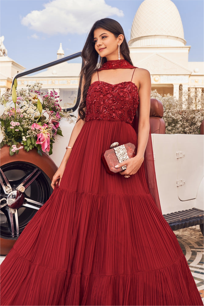 • It has beautiful embellishment on the yoke. • It has gathered and layered flare along with an embellished choker dupatta.