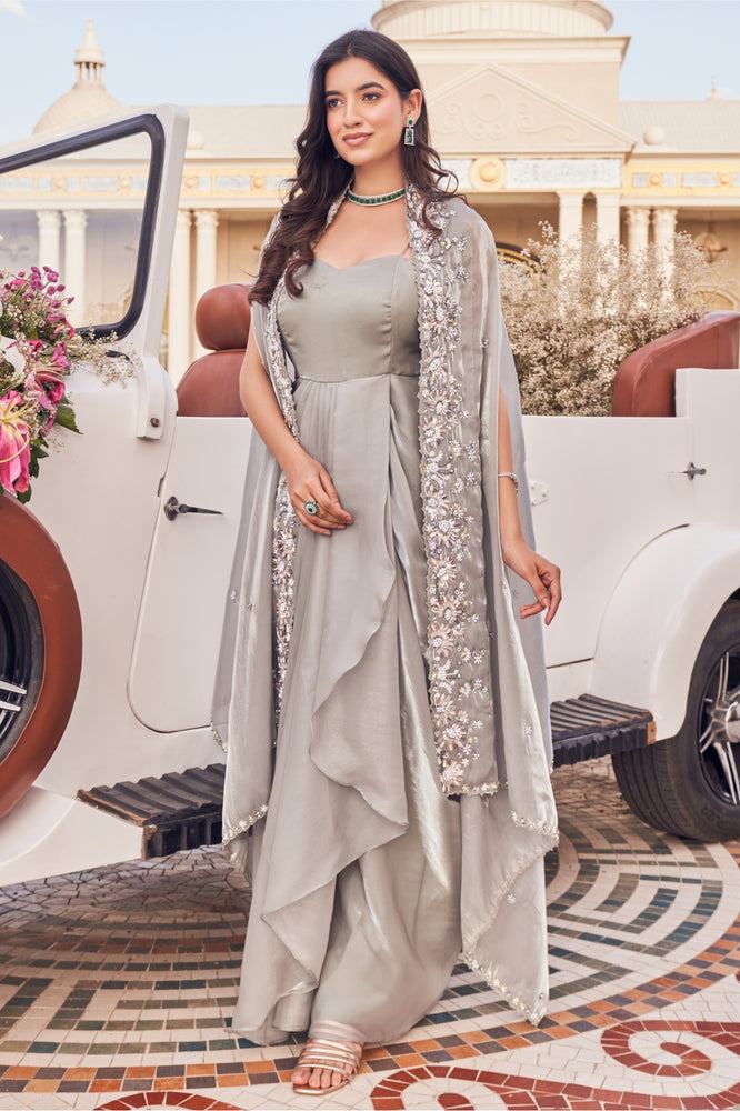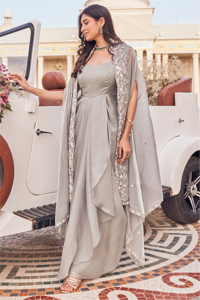 • It has beautiful embellishment on the cape. • It has a strapy drape gown.