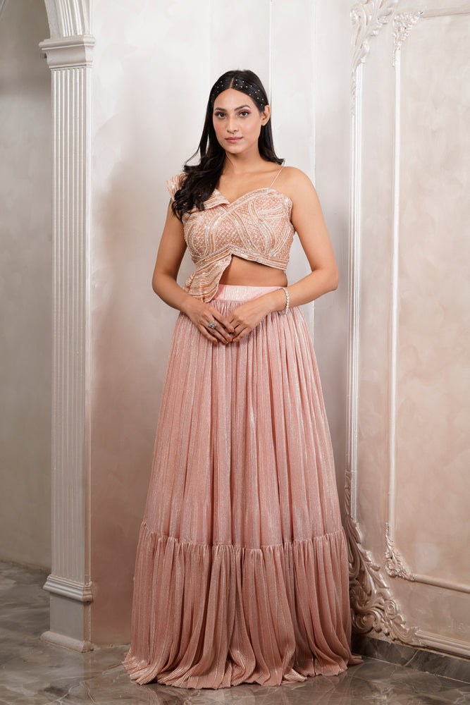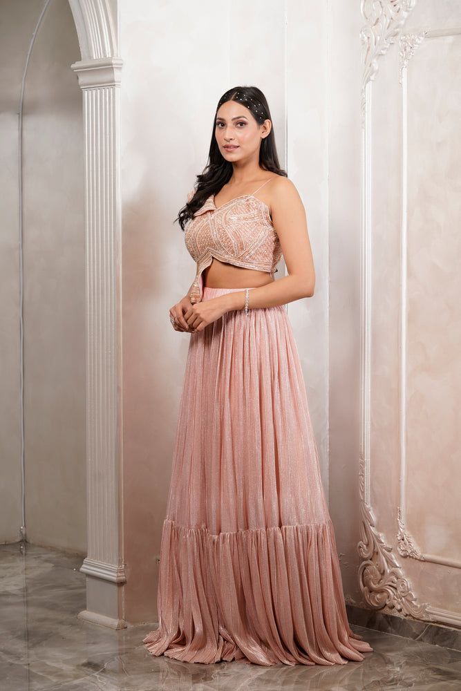 • It has a beautiful net top with heavy embellishment on it and the flaps . • Tailored fit.