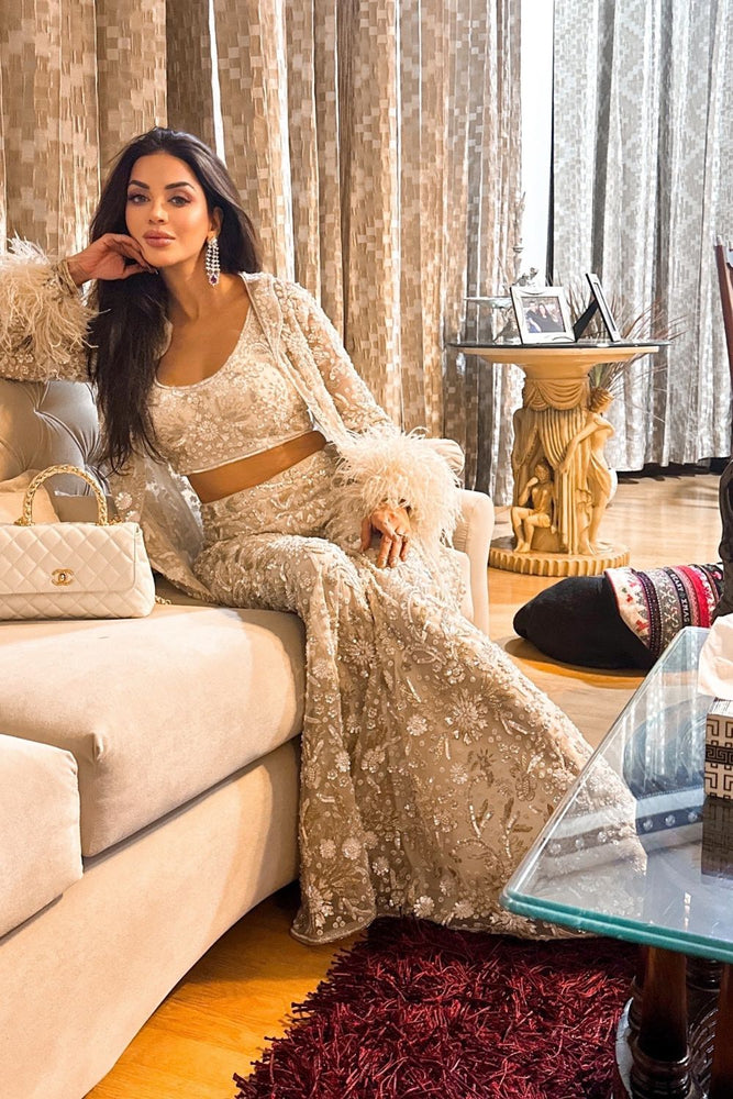 A fusion of power and grace, this ivory cord set redefines modern edge. The embellished corset sculpts her perfectly, while the tailored blazer drapes effortlessly. Flowing net fabric adds an ethereal touch, its full sleeves adorned with delicate handwork that glistens. Paired with sleek pants, this ensemble is for the bride who steps into forever with confidence—unconventional, luminous, and breathtakingly unforgettable.