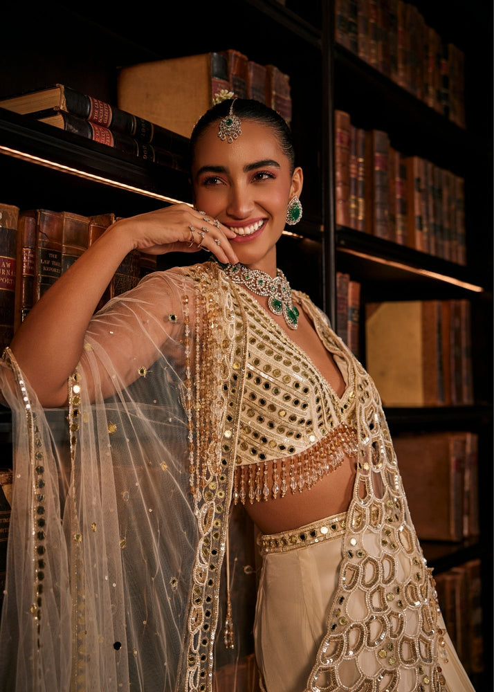 There’s something magical about beginnings - the hush before the vows, the sparkle in every glance. This ivory saree set, draped in contemporary grace with its flowing cape, feels like that moment. The delicate net and crepe whisper against the skin, while hand embroidery gleams like promises etched in gold. Designed for the bride who dares to be modern yet timeless, and for her closest circle who mirror her radiance, it’s a piece that turns every gaze into a lingering memory.