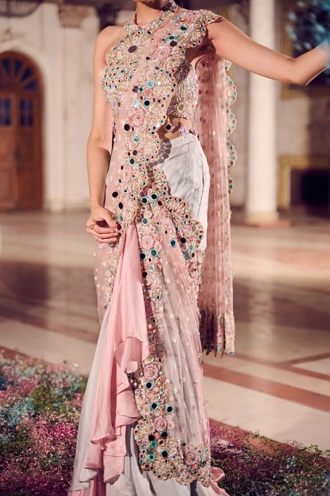 In a delicate harmony of rose gold and powder blue, this pre-draped saree redefines elegance for our bridesmaid. Crafted from soft satin organza, each fold glimmers with intricate mirror work, paired with a sleeveless halter blouse, that offers a sophisticated yet effortless look, ideal for reception nights or sangeet celebrations.