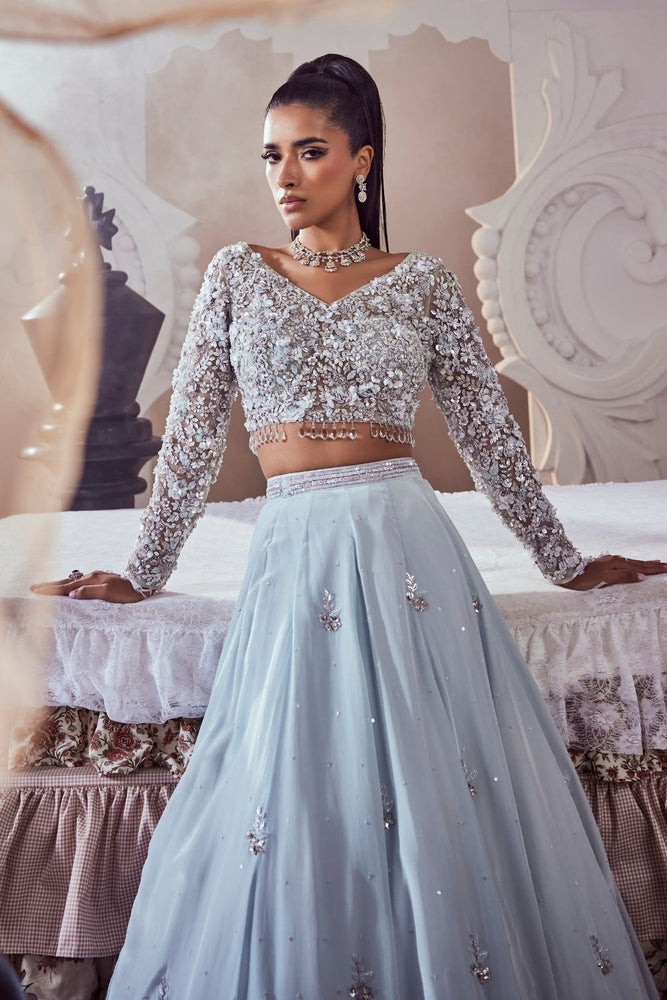 Layers of powder blue crepe and net flow like whispered secrets, weightless yet captivating. The blouse, adorned with intricate 3D stone embellishments, each shimmering like stars woven into fabric. The V-neckline flatters with effortless grace, while full sleeves drape in ethereal elegance. With every twirl she glows.
