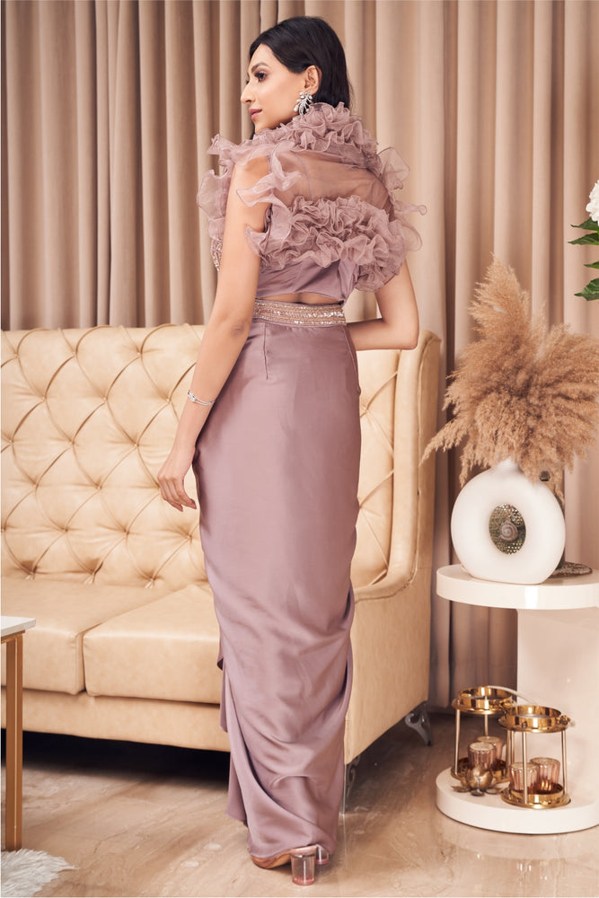 • You will receive a mauve satin dhoti, a bustier and an organza jacket