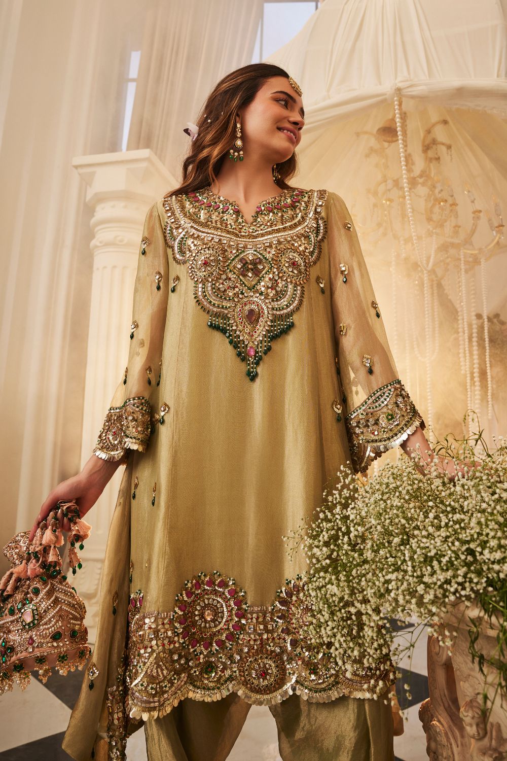 This mint suit set feels like a calming breath in the midst of celebration. The jewel-V neckline glimmering softly with hand-set jewel stones, and the bell sleeves adding a graceful sway that moves like a quiet rhythm. Crafted in delicate tissue fabric, the kurta and salwar catch the light in airy, pastel reflections, creating a look that feels refreshing yet undeniably elegant. It’s the kind of ensemble that is meant for the bride's closest circle that share serenity and joy as the festivities unfold.