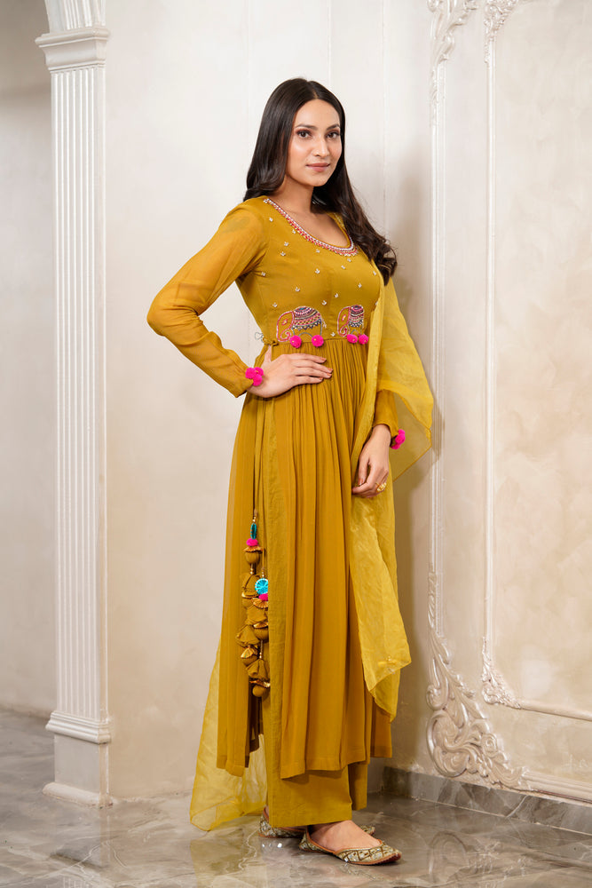 • You will receive a georgette kurta with cotton pant and an organza dupatta.