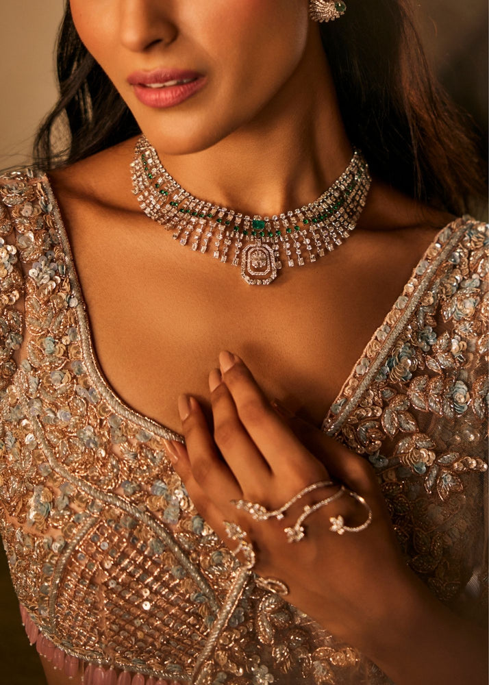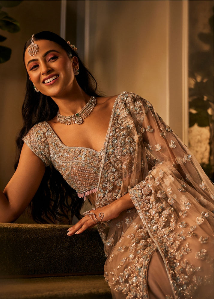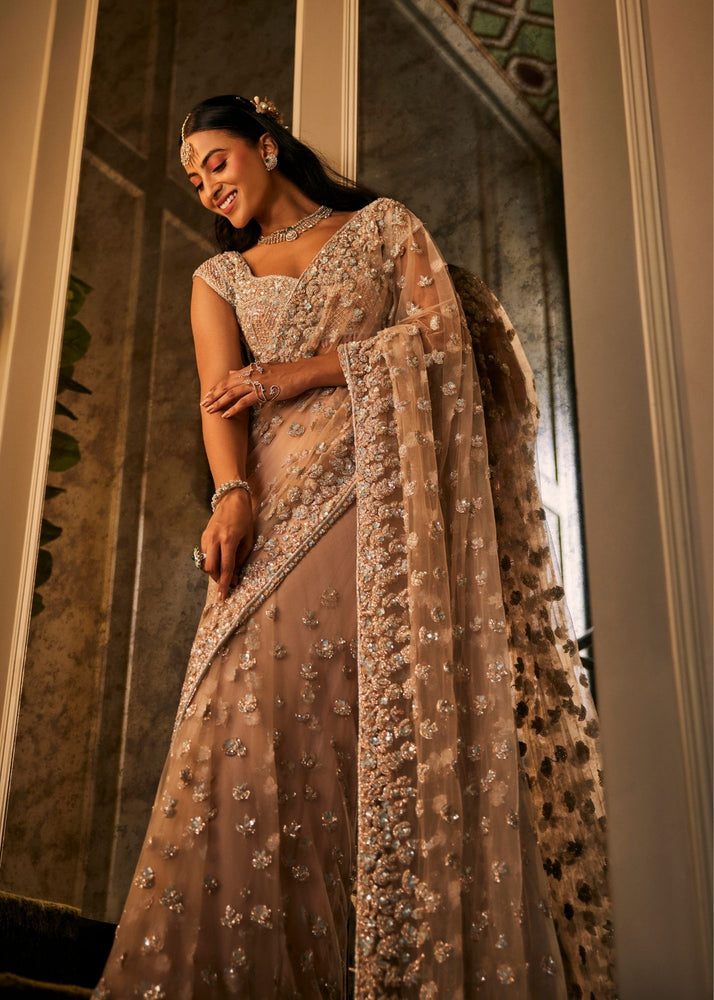 There’s a softness in the way dawn colors the horizon - gentle, ethereal, full of promise. This pre-draped saree in delicate net carries that same magic. With a sweetheart neckline and flowing cape sleeves, it drapes like poetry in motion, while hand embroidery glimmers like first light on quiet waters. An ensemble woven in romance, made for the bride who wishes to look like a dream unfolding.