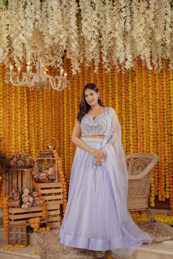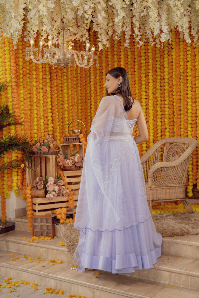 Purple organza pearl embellished blouse with flared lehenga skirt and scallop dupatta.
