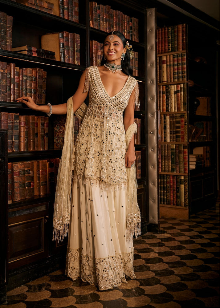 There are pieces that surprise you, this ivory peplum set is just that. The silhouette breaks away from tradition yet holds it close, with hand embroidery tracing every curve like love notes left behind. Sleeveless and airy in net and crepe, it’s made for the bride who believes her celebration is not just about vows, but about every moment of joy she shares with everyone. It’s playful, it’s graceful, and it’s destined to be remembered in laughter, dance, and the glow of togetherness.