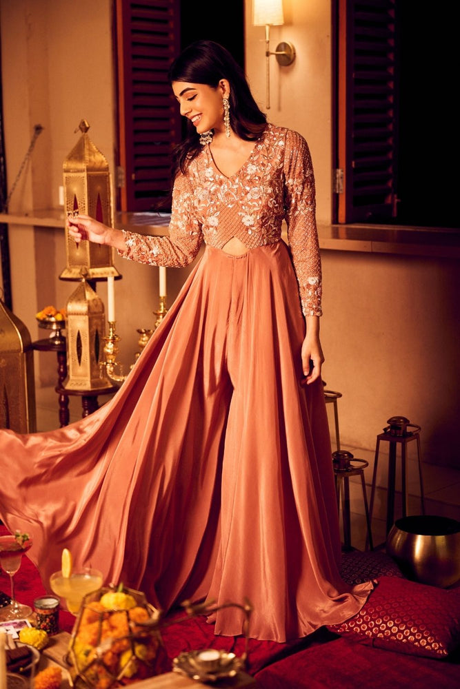 Bringing a delicate yet modern elegance to the Diwali party, the rose-gold jumpsuit is all about effortless grace! A V-neckline that flatter stye frame, and a silhouette that has you feeling free, standing out has never been so easy!