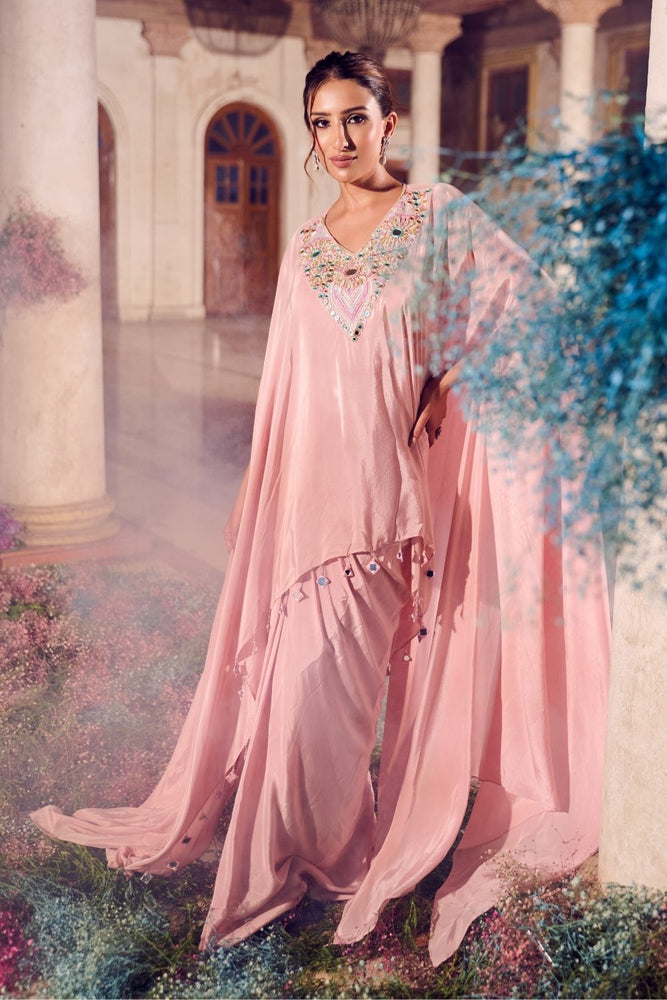 She glides through the evening, a vision in the flowing Swish silhouette. The V-neck bustier, paired with a billowing skirt and cape sleeves, shimmers with mirror work, sequins, cutdana, and nakshi, catching every whisper of light. Crafted in soft crepe with a delicate shantoon lining, it’s a dream spun for sundown celebrations and moonlit soirées.