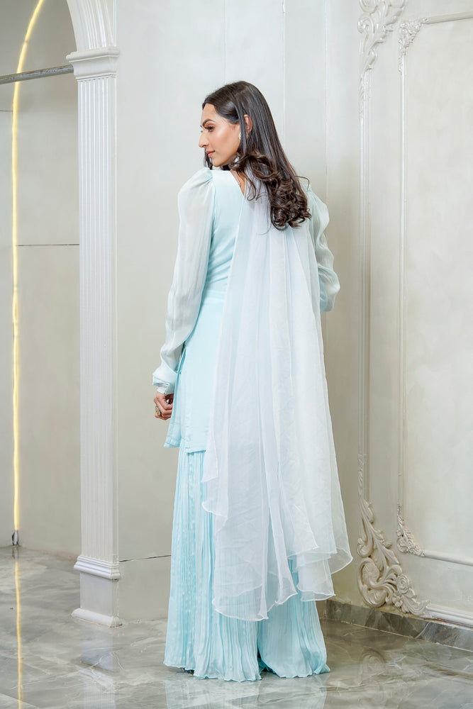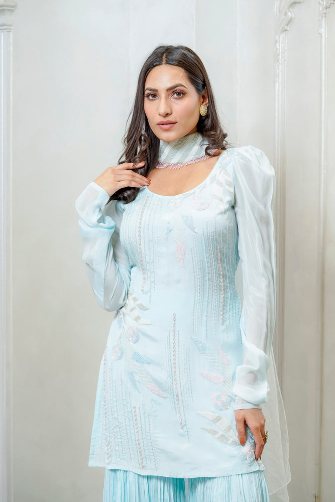 Sky blue round neck embellished kurta with flared sharara and beautifully embellished dupatta with tassels all over.