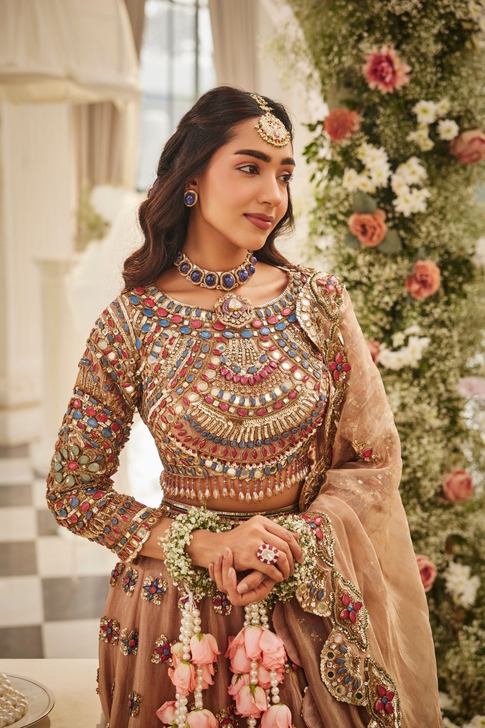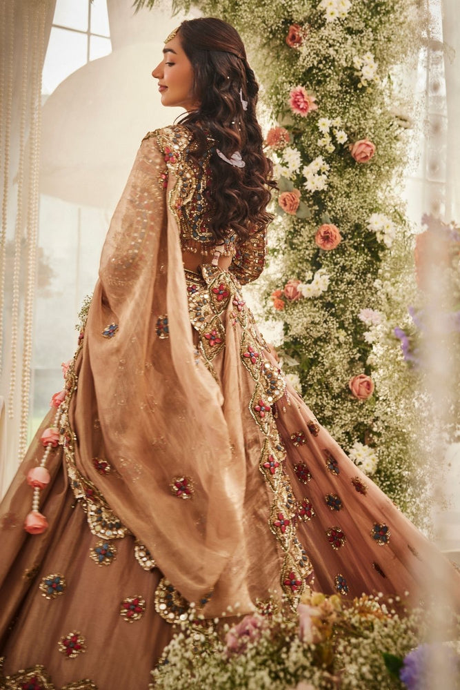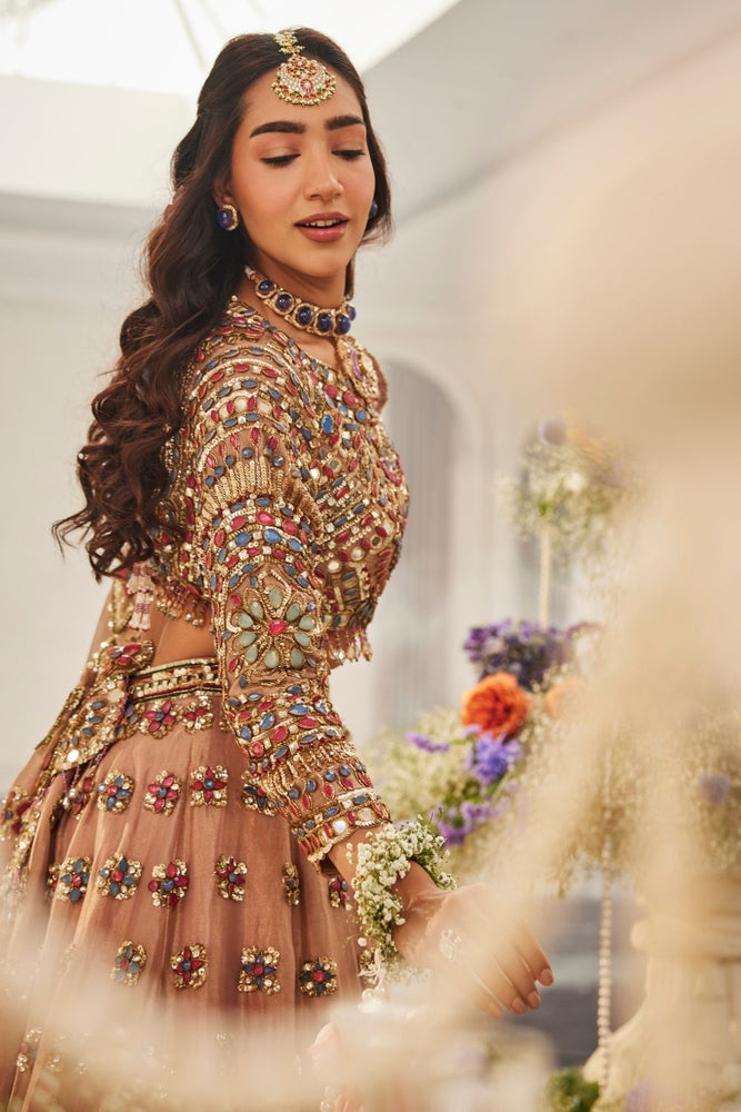 There’s a certain glow only gold can bring ~ warm, steady, almost like it’s celebrating with her. In this lehenga set, that glow comes alive through the soft rustle of tissue fabric and the subtle sheen that follows her every move. The blouse, framed with a jewel neckline and full sleeves, sparkles with hand-placed stones that twinkle like tiny celebrations of their own. And as the dupatta rests gently over the look, meant to complete it all elegantly!