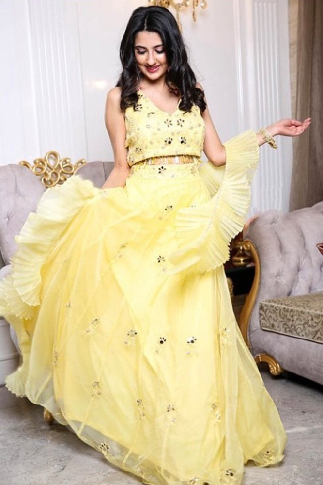 •Golden Mirror & Zardosi Work With Thread Outline On Blouse & Skirt