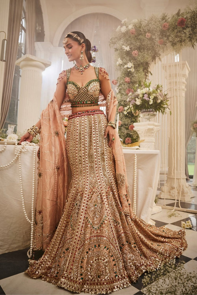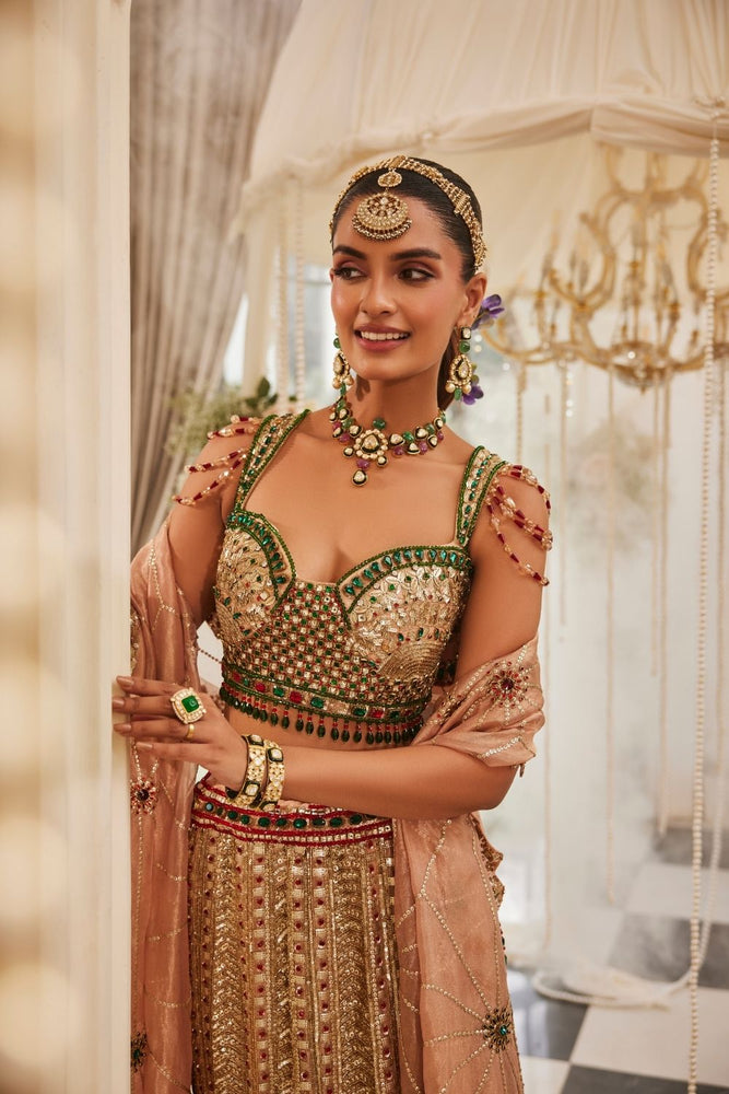The gold tissue lehenga is all about movement, light glistening off it and full of that celebratory sway that instantly draws the eye. Its sweetheart blouse, sleeveless and sparkling with jewel, adds a bright, modern glow that feels joyful rather than formal. The dupatta then slips into the look with an easy softness, balancing the shimmer with a graceful touch. Together, the ensemble feels uplifting and luminous, the kind of gold that doesn’t overpower, but instead wraps her in a warm, glowing confidence the moment she steps in.