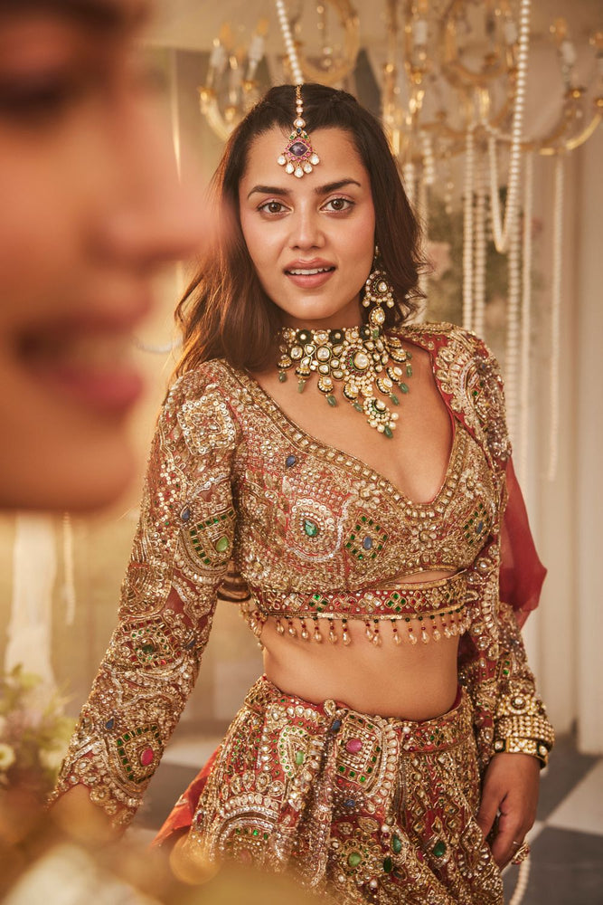 This red lehenga set carries the kind of power only a bride can wear ~ the deep leaf neckline framed with hand-placed jewel stones, the sleeves adding a touch of poised elegance, and the tissue lehenga shimmering with every step she takes. The dupatta settles around her like a breath of warmth, holding the weight of blessings, excitement, and every shared glance from the women who stand beside her. Bold yet graceful, it becomes a radiant chapter in her story, unfolding in a hue that has always belonged to celebration.