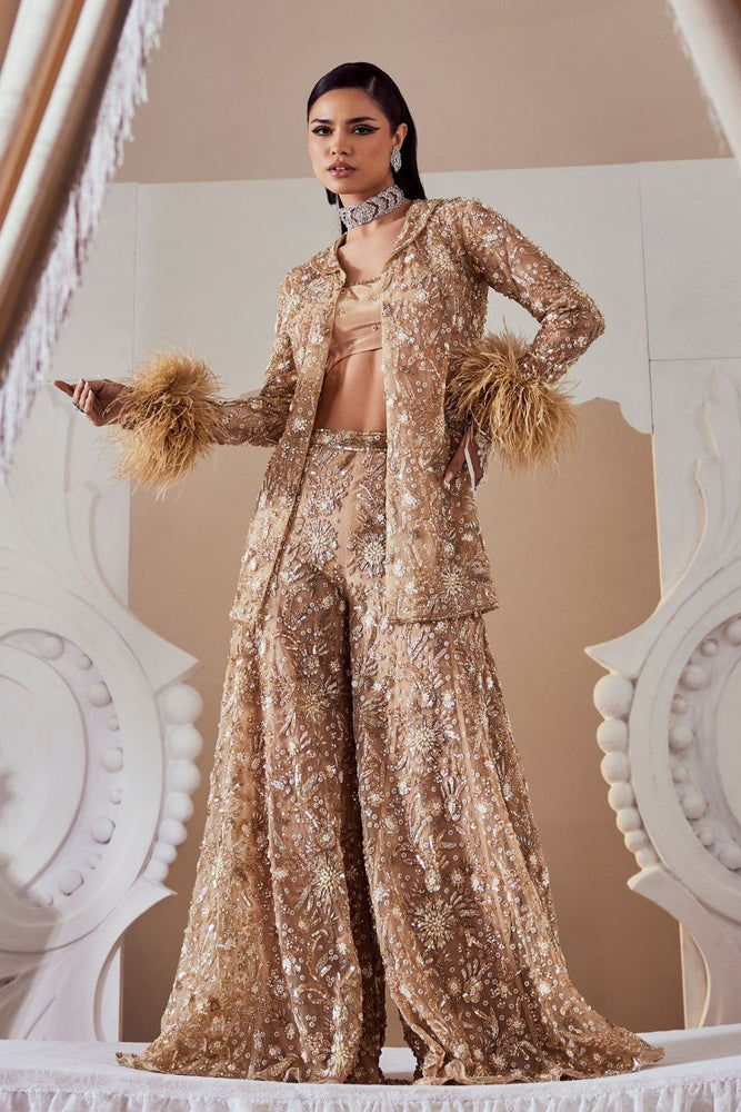 Drenched in golden allure, the cord set redefines wedding elegance with a modern touch. Hand-embellished details shimmer across the net fabric, top to bottom, catching the light like scattered gold flecks. The structured blazer, exudes confidence, while full sleeves adorned with delicate feathered cuffs add a whisper of softness. A fusion of power and grace, this ensemble is for the one who dares to be different