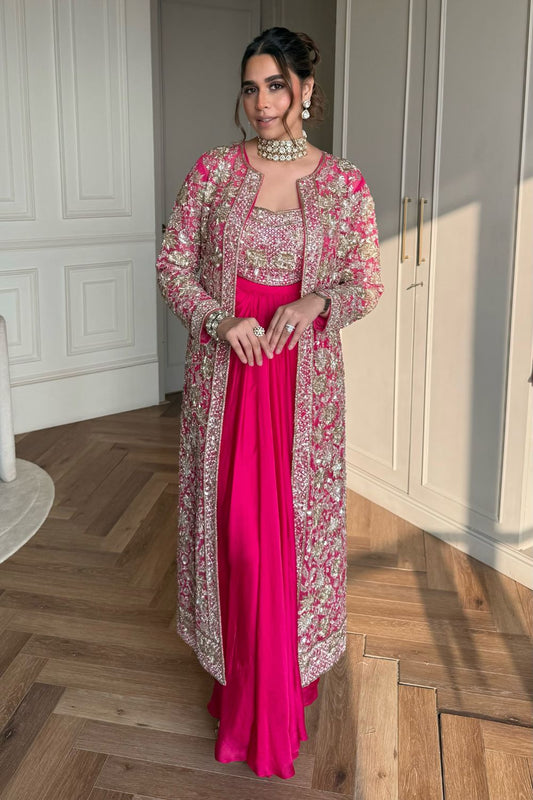 Summiyaa from house of misu in hot pink skirt and blouse with jacket