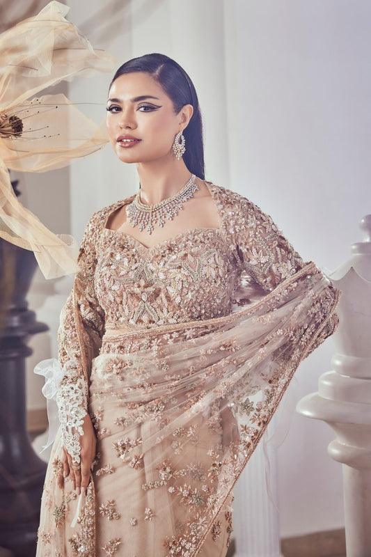 Theodora beige heavy zardozi embellished net saree set with sweetheart neckline