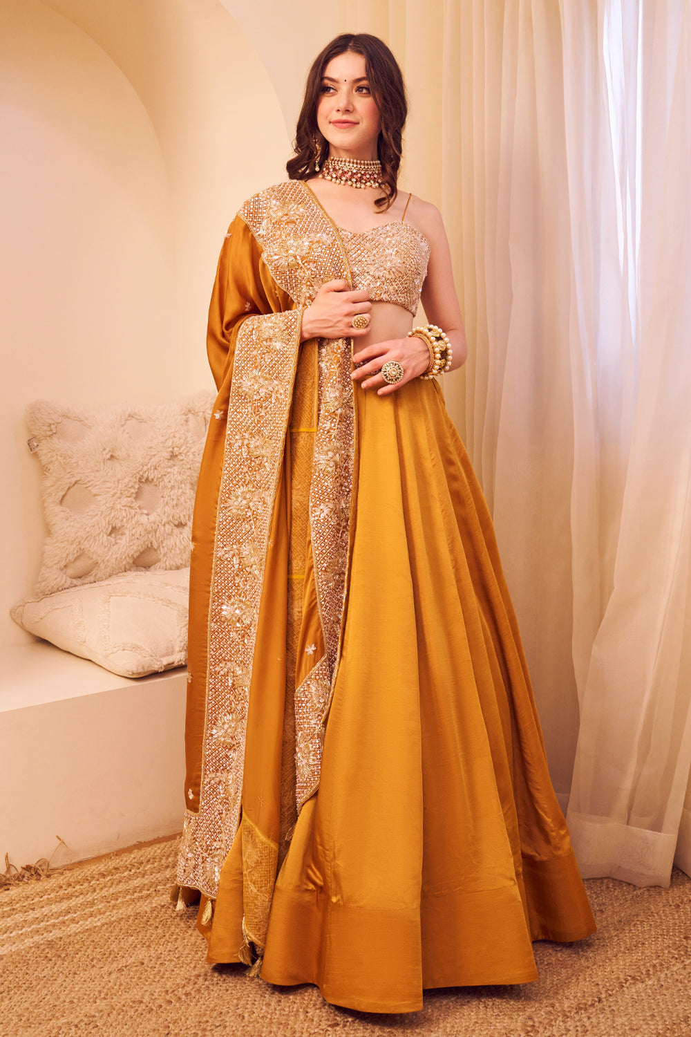 Aashiyaan Mustard Satin Silk Lining Shantoon Gul Jaal Waistband Lehenga Set
